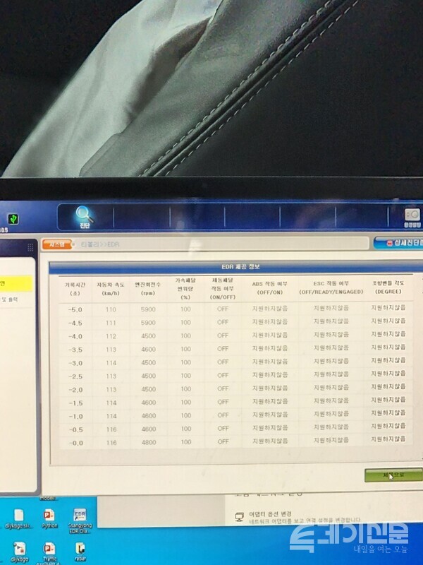 주행기록장치(EDR) 검사 실효성에 대한 ‘물음표’도 남는다. 급발진 의심 사고에서 교과서처럼 나오는 EDR 수치가 있다. ‘100, 99, off’. 여기서 100은 스로틀 밸브가 100% 열렸다는 의미다. 이어 99%는 가속페달을 끝까지 밟았으며, OFF는 브레이크가 전혀 작동하지 않은 상태가 약 5초 이상 유지됐다는 것을 의미한다.