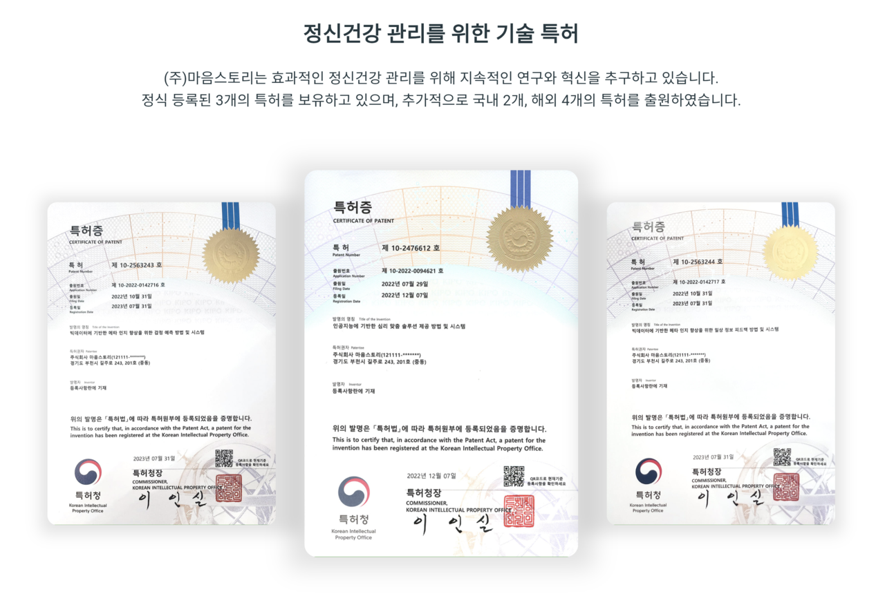 세 번째는 ‘인공 지능에 기반한 심리 맞춤 솔루션 제공 방법 및 시스템’ 특허입니다. AI를 기반으로 현재 심리 상태에 대해 분석 후 솔루션을 제시하는 서비스입니다.