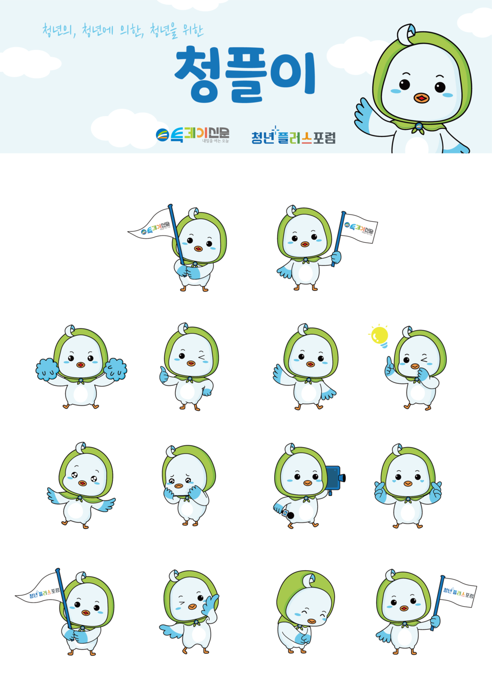 ‘청플이’는 파랑새를 모티브로 디자인된 캐릭터이며, 청년들의 밝은 미래를 위해 희망과 행복을 전하겠다는 투데이신문과 청년플러스포럼의 핵심 가치를 담고 있다.