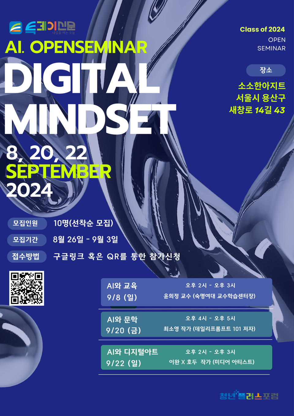 이번 세미나는 AI에 관심 있는 이들에게 지식과 인사이트를 제공할 뿐만 아니라 네트워킹 기회도 마련할 예정이다. 선착순 10명을 모집하며, 신청은 8월 26일부터 9월 3일까지 구글 링크 또는 QR 코드를 통해 가능하다.