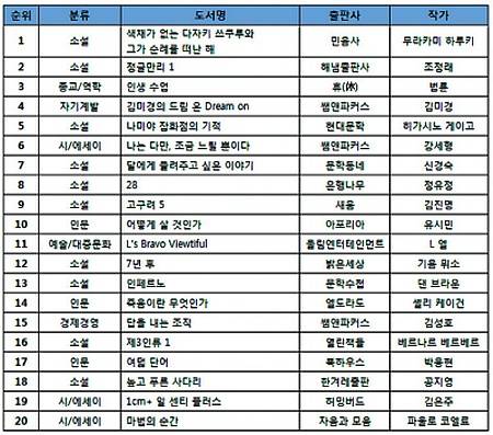 이어 근소한 차이로 조정래의 <정글만리 1>이 2위를 차지했다. 이 밖에 20위권 내에 <나미야 잡화점의 기적>, <달에게 들려주고 싶은 이야기>, <28>, <고구려 5>, <7년 후>, <인페르노 1>, <제3인류 1>, <높고 푸른 사다리> 등이 올랐다.