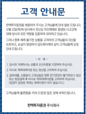 앞서 올해 마지막 선물·옵션 동시만기일인 12일 한맥투자증권은 코스피200 12월물 콜옵션과 풋옵션 거래를 하면서 43종목, 3만6000건 거래에 대해 시장가격보다 훨씬 높거나 낮은 가격대에 주문을 넣는 실수를 했다.