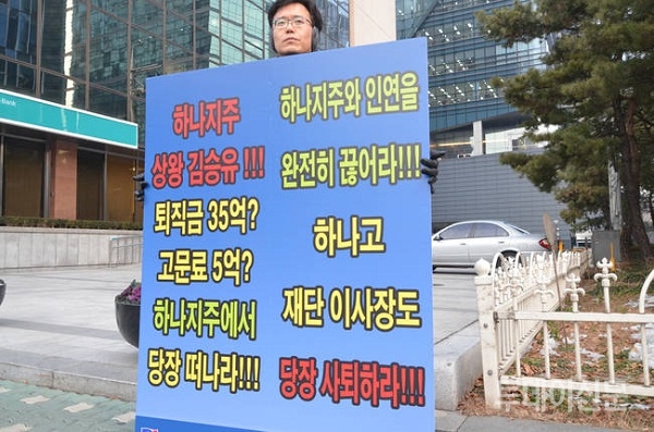 【투데이신문 박나래 기자】김승유 전 하나금융지주 회장의 즉각퇴진을 요구하는 1인 시위가 17일 열렸다.