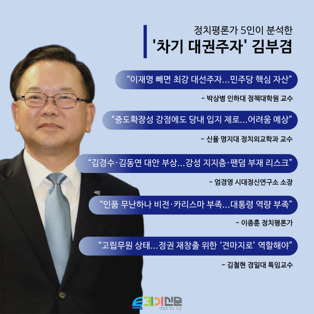 <투데이신문>이 정치평론가 5인의 분석을 취합한 결과, 김부겸 전 국무총리의 가장 큰 강점은 ‘중도 확장력’으로 평가됐다.