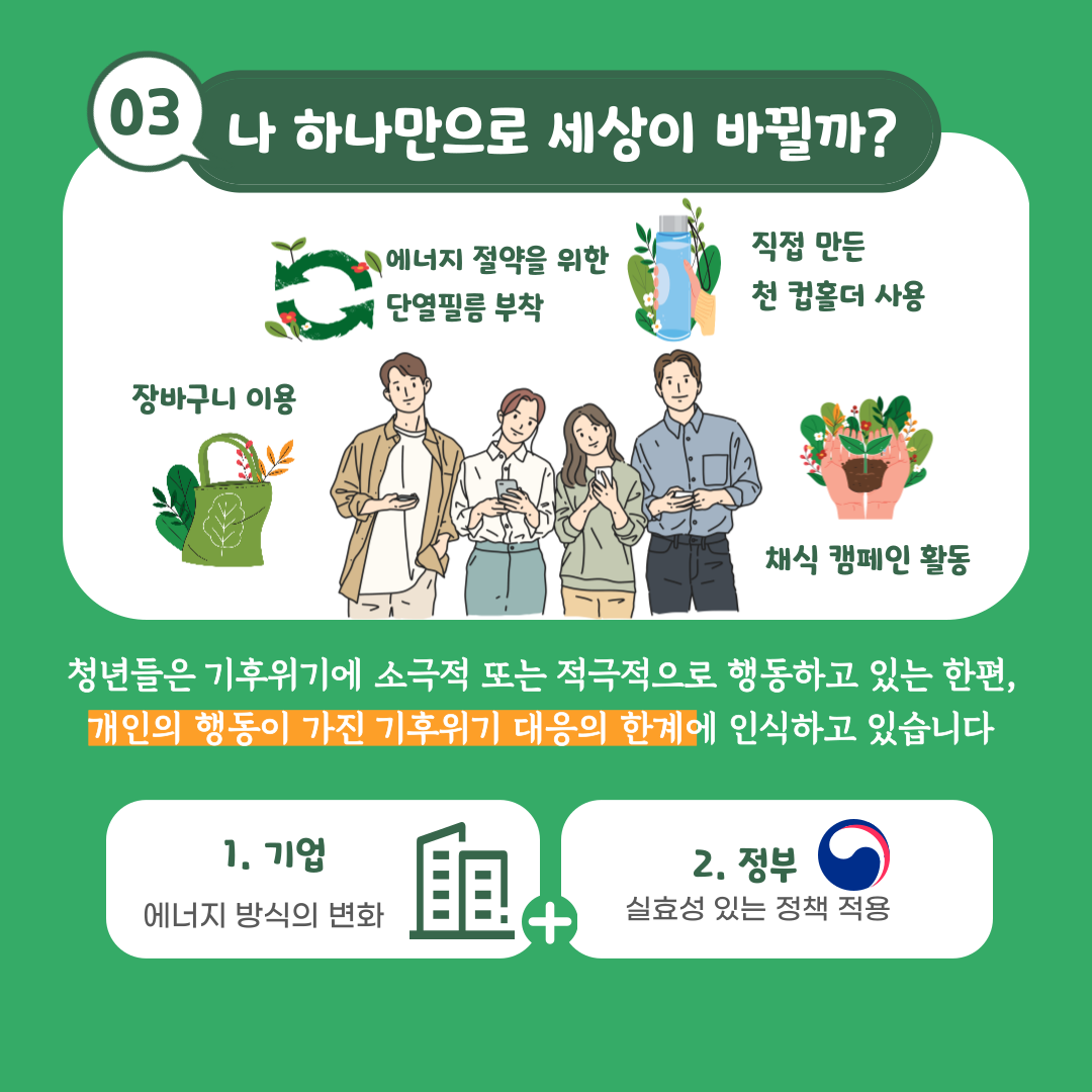 20대 청년 100명을 대상으로 한 설문조사 결과, 청년들은 기후위기를 ‘불안감’, ‘슬픔’, ‘무력감’으로 체감하고 있었다. 하지만 기후 행동 실천 여부는 ‘그렇다’ 56%, ‘그렇지 않다’ 44%로 나뉘었다. 실천하는 청년들은 채식 캠페인 주도하기, 직접 만든 천 컵 홀더 사용하기 등 일상에서 변화를 시도하고 있었다. 기후 변화에 대한 분노가 크다고 답한 청년들은 “기업의 실책이 개인의 노력을 무력화시킨다”, 불안을 가장 크게 느낀다고 답한 청년은 “날씨에 영향을 받고, 잦은 이상기후에 미래가 걱정된다”고 했다.
