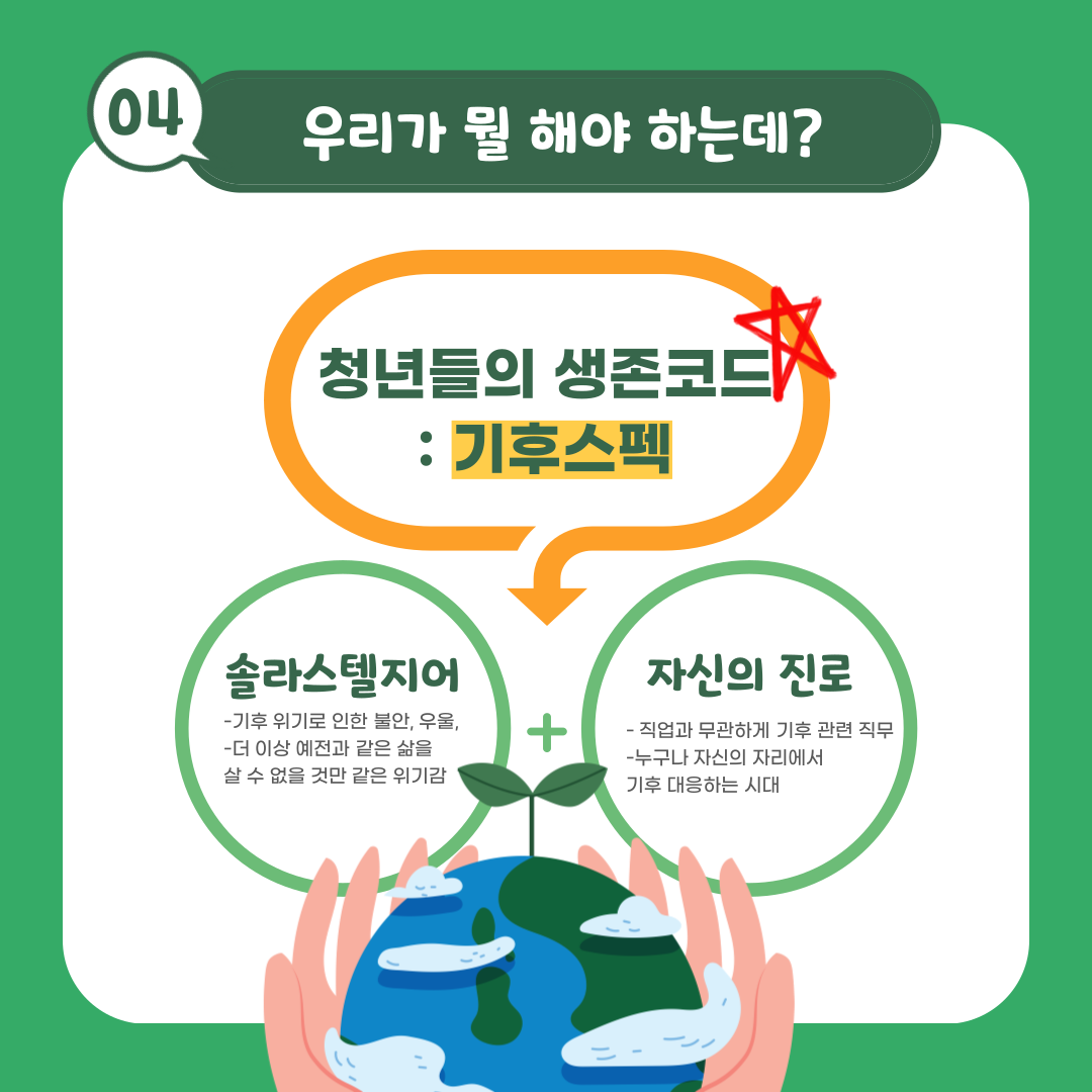 기후스펙, 즉 지속가능한 미래를 위한 생존 역량으로서 청년들은 ‘지속 가능한 삶을 실천하는 능력’, ‘친환경 산업에 대한 이해력’, ‘환경 정보 분석력’을 중요한 역량으로 꼽았다. 하지만 이를 진로로 연결하기 위해서는 제도와 사회의 뒷받침이 필요하다는 목소리가 크다.