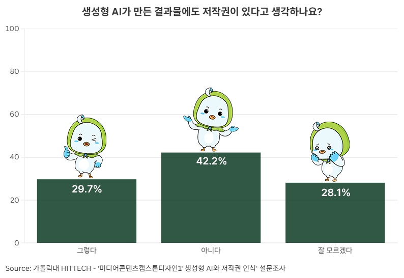 생성형 AI 결과물의 저작권 인식은 여전히 분명하지 않았다. AI가 만든 콘텐츠에 저작권이 있느냐는 질문에는 ‘없다’는 응답이 42.2%로 가장 많았고, ‘있다’는 29.7%, ‘잘 모르겠다’는 28.1%로 나타났다.