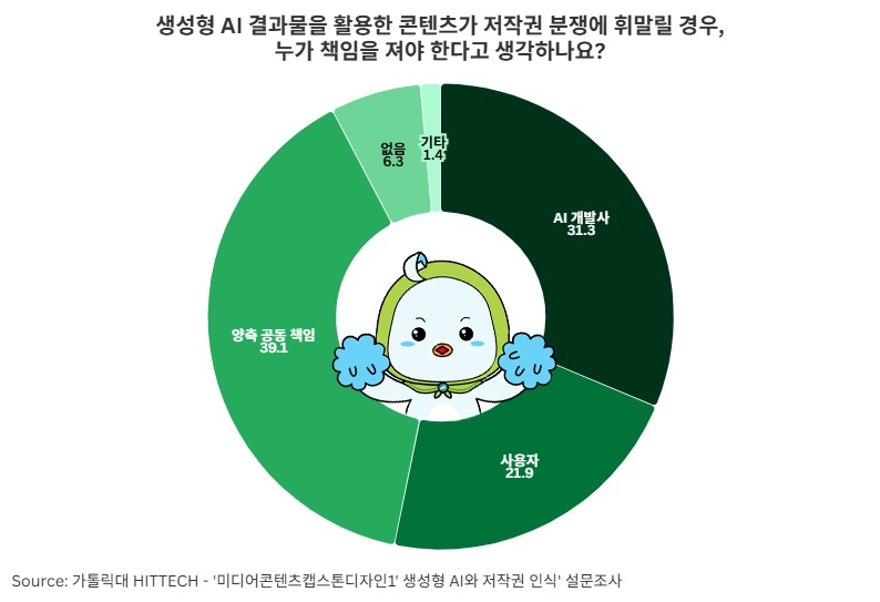 저작권 분쟁이 발생했을 시 책임 소재에 대해서는 ‘AI 개발사와 사용자 모두 책임이 있다’는 의견이 39.1%로 가장 많았다. ‘개발사 단독’(31.3%), ‘사용자 단독’(21.9%)이 뒤를 이었다.