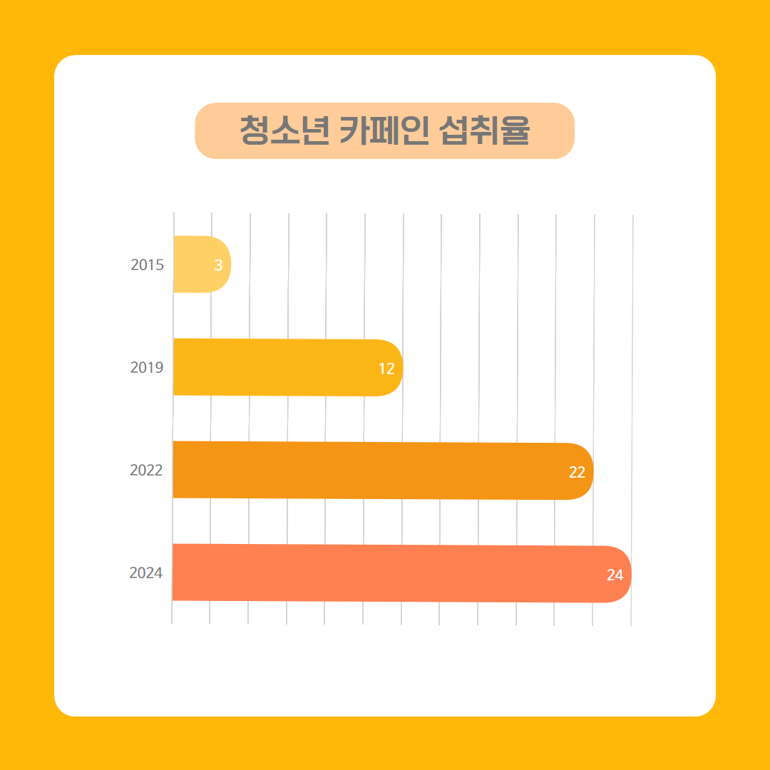질병관리청이 진행한 청소년건강행태조사에 따르면, 주 3회 이상 에너지 음료를 섭취하는 청소년 비율은 2014년 3.3%에서 2019년 12%, 2022년 22%, 그리고 2024년에는 무려 24%에 달했다. 불과 10년 만에 20%p 가까이 증가한 수치다. 이는 청소년의 카페인 섭취량이 꾸준히 증가세를 보이고 있음을 여실히 보여준다.