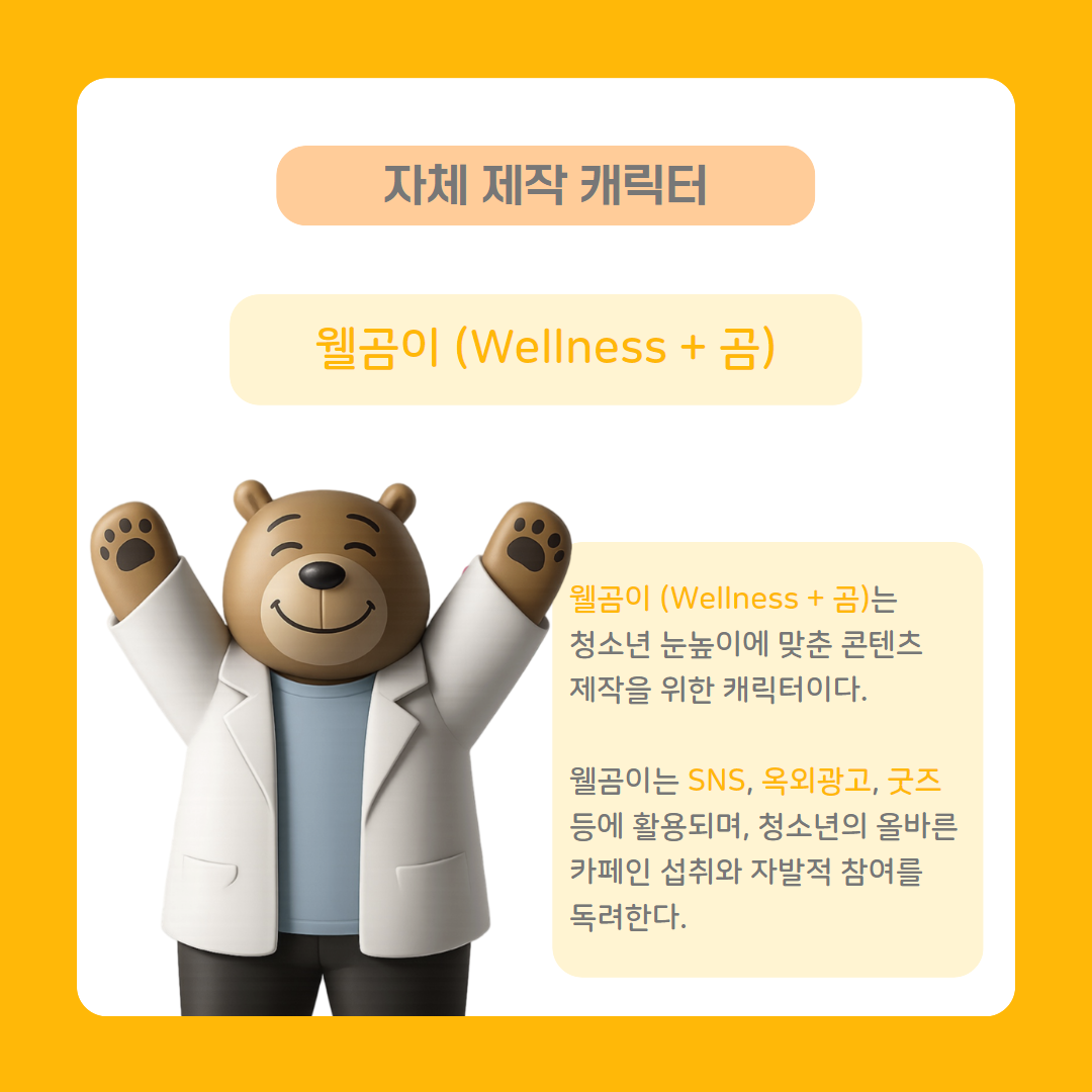 MC 프로젝트의 핵심은 청소년 눈높이에 맞춘 콘텐츠 제작이다. 청년중문팀은 주 타깃층인 청소년의 관심을 끌기 위해 자체 캐릭터 ‘웰곰이’ 를 개발했다. 웰곰이는 SNS, 옥외광고, 굿즈 등에 다양하게 활용되며, 정보 전달의 거부감을 줄이고 접근성을 높이는 역할을 한다.