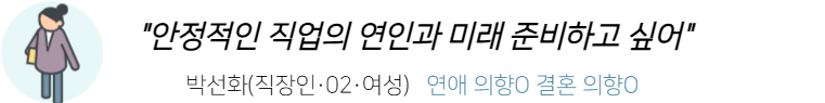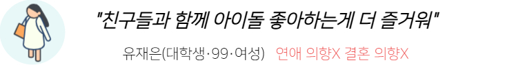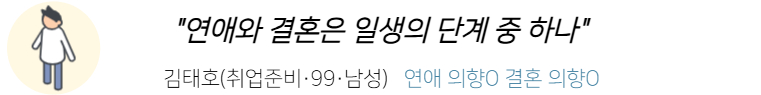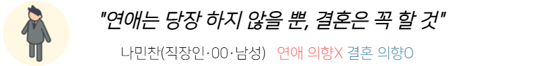 연애는 하고 싶지만 결혼하고 싶지 않다고 답한 유형의 경우 ‘결혼으로 인한 경제적 부담을 감당할 자신이 없다’거나 ‘결혼 제도 자체에 동의하지 않는다’는 이야기를 들려줬다. 반대로 연애는 하고 싶지 않지만 결혼은 하고 싶은 유형은 자신의 비연애 상태를 ‘일시적인 것’이라고 설명하며 확고한 결혼 계획과 의지를 보여줬다.