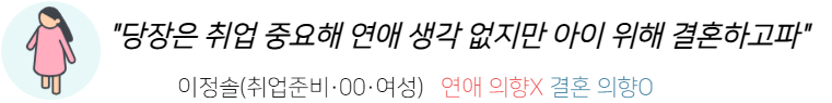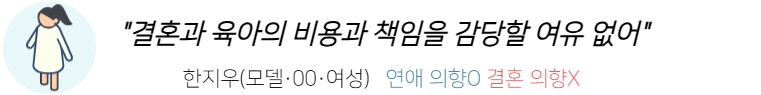 “지금은 취업 준비와 아르바이트를 병행하고 있어 새로운 사람을 만나 연애하기는 부담스러운 상황이다. 당장 연애를 하지 않을 뿐 마음의 여유가 생기면 연애할 생각이 있다. 결혼은 30대 중반 전까지는 해야 한다고 생각한다. 이상적인 중년의 모습을 떠올리면 부모님을 생각하게 되는데, 우리 부모님을 보면 확실히 가정이 있어야 외롭지 않을 것 같다. 다만 아이가 결혼하려는 가장 중요한 이유라서 (아이를 낳지 않을 거라면) 30대 중반 넘어서는 남자친구가 있어도 굳이 결혼하지 않을 것 같다. 특히 결혼은 집안과 집안끼리 관계를 맺는 것인데 아이를 낳지 않는다면 그런 부담을 감내할 정도로 결혼이 중요한 것이라는 생각이 들진 않는다.”