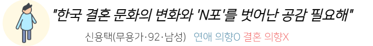 “결혼이라는 제도에, 엄밀히 말하면 한국에서 결혼이라는 제도에 동의를 하지 않는다. 결혼식이라는 세리머니를 해야하고 가족과 가족의 결합이 잘 돼야만 하는 문화가 비정상적이라고 생각한다. (청년들의 연애 감소는) 경제적인 부분도 크겠지만 사회가 청년에게 원하는 점들이 많아서라고 생각한다. 직장, 주거 등이 번듯해야 사회 구성원으로 인정해주는 분위기인데 사실 이걸 달성하기가 점점 어려워지고 있다. 연애나 결혼 이외의 과업들을 달성하기 위해 소모하는 에너지가 크다. 기성세대는 당장 인구절벽 이야기가 나오니 이에 급히 대처하고자 청년들의 연애와 결혼에 대한 생각을 멋대로 진단하고 있다. 청년세대의 고민과 포기에는 연애·결혼·취업 이런 전통적인 부분만 있지 않다. ‘n포’가 다가 아니다.”