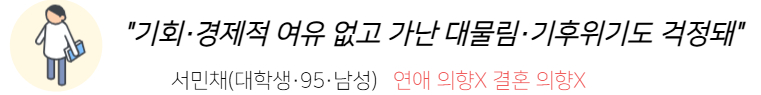 “연애할 기회가 없었다. 그리고 자아실현이나 취미생활에 더 집중하고 싶었다. 또 연애나 결혼에 관한 부정적이고 자극적인 콘텐츠가 많다 보니 그런 걸 보면 하고 싶다가도 꺼리게 되더라. 물론 경제적인 이유도 있다. 아무래도 연애하면 데이트 비용이라든지 돈이 드니까. 가난을 대물림 하고 싶지 않아서 아이 생각도 없다. 기성세대와 달리 지금 청년세대는 아무리 열심히 노력해도 경제적 계층 이동이 쉽지 않다보니 지금 상황에서 크게 나아지지 않은 상태로 아이를 낳는다고 생각하면 많이 막막하다. 그리고 기후위기가 심각한데 내가 낳은 아이가 수명을 다할 때까지 살 수 있을까 하는 우려도 있다. 그렇지만 지자체에서 운영하는 데이팅 프로그램이 제대로 마련된다면 참여할 의향이 있다.”