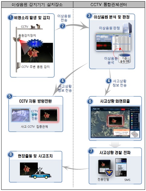 폐쇄회로 TV(CCTV)가 비명소리나 차량 충돌 소리에 반응하여 이를 통합관제센터에 자동으로 알려주는 기술이 개발되었다.
