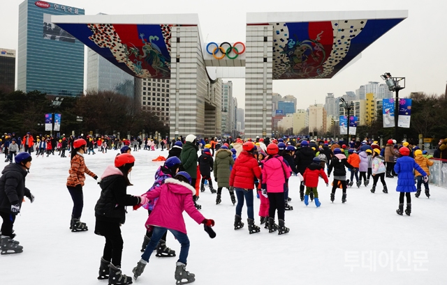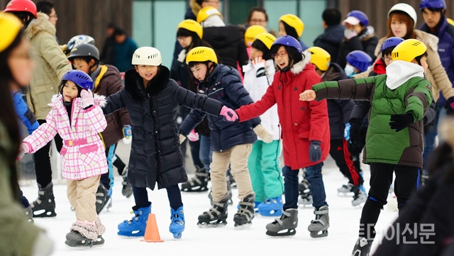 올림픽 스케이트장 잠깐 풀린 날씨에 많은 어린이들이 올림픽 스케이트장에서 스케이트를 즐기고 있다.