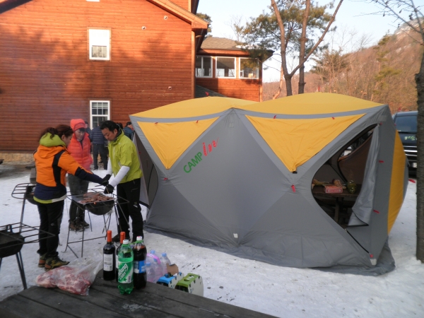 이번 산행에 큰 도움이 된 것은 텐트다. 바닥이 없는 텐트로 춥고 바람 부는 날씨에 그만이다. 그리고 설치 및 정리가 1~2분밖에 소요되지 않으니 회원들 모두 신기해했다. 텐트 안에서 고기를 구우면 숯불연기로 텐트가 그을릴 수 있어 밖에서 구워, 텐트 안으로 공수하는 방법을 택했다. 미리 준비한 김치삼겹살 찌개와 김이 모락모락 나는 밥, 그리고 숯불BBQ 그리고 가벼운 와인 한잔을 겉들이니 여기가 바로 천국 같다. 회원들 각자의 사는 얘기와 2013년을 보내며 아쉬웠던 점들을 나누다 보니 밖은 어느새 어둑어둑 해져간다. 바쁘게 사는 것도 좋지만 간혹 자연의 품에서 시간을 보내는 것도 해 볼만 한 것 같다. 요즘 같은 핵가족 시대에는 가족의 구성원도 적고 바삐 살다보니 가족 간의 대화가 많이 부족하다고 필자도 느낀다. 이럴 때 아무 생각 없이 훌쩍 도시를 떠나 가족 간의 캠핑여행도 해볼 만하다.