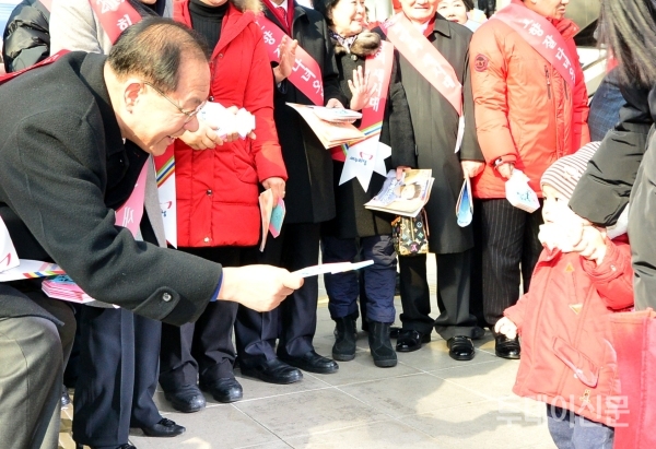 새누리당 지도부는 이날 오전 '2014 희망의 새 시대, 고향 잘 다녀오세요'라는 어깨띠를 두르고, 박근혜 정부의 1년 성과를 담은 홍보물을 배포하면서 귀성객들과 일일이 악수를 하며 덕담을 나눴다.