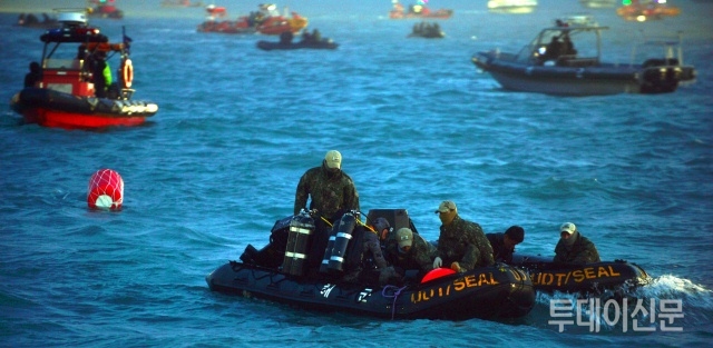 구조팀은 이날 해경 함정 90척, 해군함정 32척, 민간어선 등 선박 200여척, 헬기, 30여대의 항공기, 500여명의 민관 잠수사를 동원해 침몰한 세월호 안팎에서 실종자 수색작업을 벌였다.