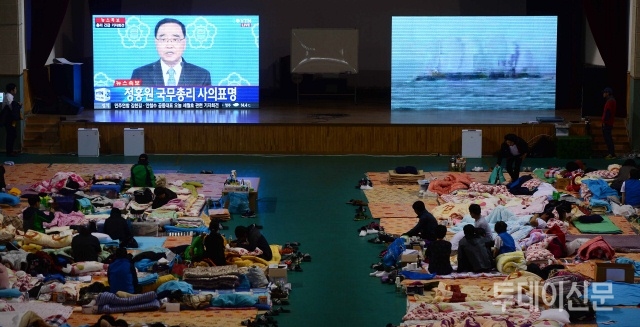 | ▲ 세월호 여객선 침몰 참사가 발생한지 12일째인 27일 전남 진도군 실내체육관에서 실종자 가족들이 정홍원 국무총리의 사퇴 기자회견을 바라보는 모습. ⓒ뉴시스 | ||