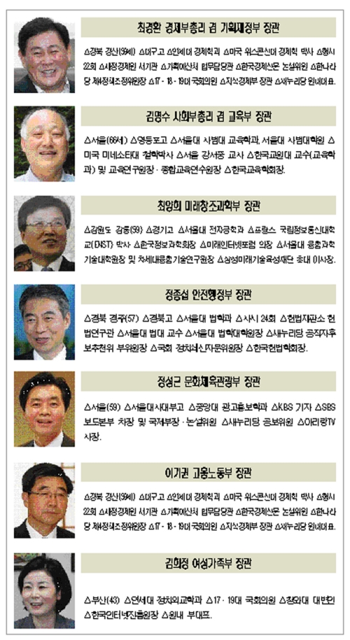 또 미래창조과학부 장관에는 최양희 삼성미래기술육성재단 이사장, 안전행정부 장관에 정종섭 서울대 교수를 각각 내정했다. 문화체육관광부 장관에는 정성근 아리랑TV 사장, 고용노동부 장관에는 전 고용부 차관인 이기권 한국기술교육대 총장, 여성가족부 장관에는 새누리당 김희정 의원을 내정했다.