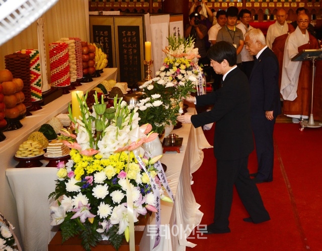 | ▲ 새정치민주연합 김한길·안철수 공동대표가 24일 오전 서울 종로구 조계사 대웅전에서 세월호 참사 희생자 위령제에 참석해 헌화하고 있다 ⓒ뉴시스 | ||
