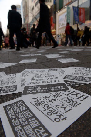 지난해 12월16일에는 서울 지하철 홍대입구역에서도 박근혜정부 비판 전단지가 뿌려졌고, 지난달 26일에는 서울 강남역, 27일에는 명동, 28일 회현동에 전단지가 뿌려졌다.