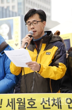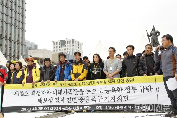 회견문 낭독을 맡은 416가족협의회 운영위원장이자 단원고 故전찬호 군의 아버지 전명선 씨는 “정부는 시행령안 폐기와 세월호 선체인양을 촉구하는 여론을 잠재우고 있다. 또 돈 몇 푼 더 받아내려고 농성하는 유가족으로 호도하려는 의도를 가진 정부의 행태에 분노한다”며 “세월호 참사 1주기를 앞두고 추모와 진상규명 열기가 높아져가는 이때에 져야 할 책임은 회피하고 돈으로 희생자와 피해 가족을 능욕하고 있다”고 정부의 태도를 강하게 규탄했다.