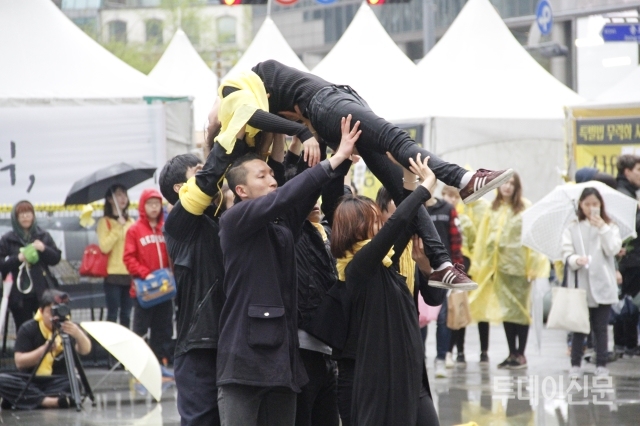 한편 광화문 광장 뒤에서는 7명으로 이루어진 그룹 ‘움스’가 세월호 인양과 유가족, 실종자를 추모하기 위해 몸짓을 통한 퍼포먼스를 벌였다. 움스 멤버인 최창도(32)씨는 “실종자 9명을 찾는 것과 세월호 인양에 중점을 두고 퍼포먼스를 했다”며 “나는 세월호 참사와 관계없는 사람인데도 불구하고 내 마음이 다 타버린 것 같다. 유가족과 실종자가족을 볼 때마다 마음이 더 아프다”고 말했다.