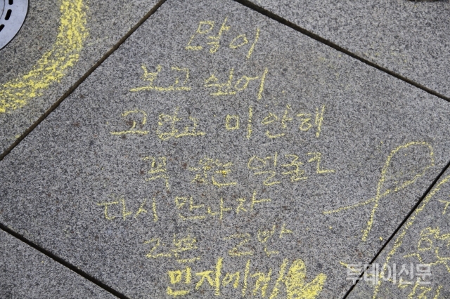 이러한 퍼포먼스를 진행하기 위해 분필과 물감 등을 들고 광화문 광장으로 자원봉사를 나온 구름(가명·29)씨는 “시민들 개개인이 각자 표현하고 싶은 메시지들이나 문구들을 마음속에서 꺼내 바닥에 쓸 수 있도록 우리는 재료만 들고 나왔다”며 “앞으로 계속 우리는 오늘을 계기로 진실이 나올 수 있게 노력할 것이다”고 말했다.
