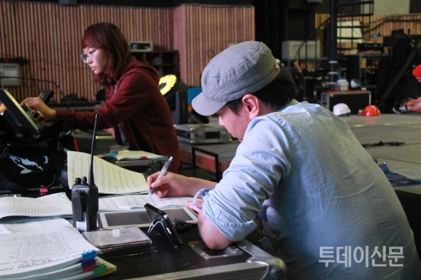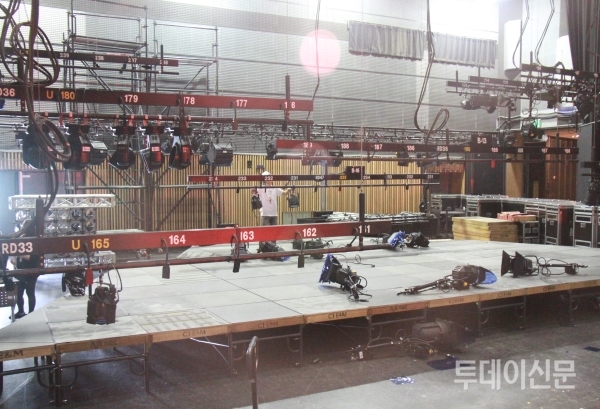 <본지>는 지난달 17일 오전 9시 30분, 서울 마포구에 있는 CJ E&M 상암스튜디오에서 CJ E&M 우세균 무대감독을 만났다. 기자는 그를 따라 멀티스튜디오로 향했다. 멀티스튜디오 내부에는 무대 설치 작업이 한창이었다. 우 감독은 주변에 흩어져서 일하고 있는 영상미술팀에 소속된 김민재 조명 부감독, 심수진 무대디자이너 등을 불러 이들과 반갑게 인사했다.