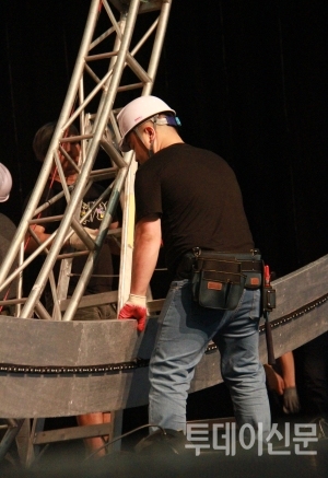 오전 10시 30분 무렵, 구조물팀이 철근 조립작업을 시작했다. 알록달록 다양한 색의 안전모를 쓴 사람들이 무대 위를 일사불란하게 움직였다. 이윽고 세트와 영상작업, 기본 주조물 골조작업이 이뤄졌다.