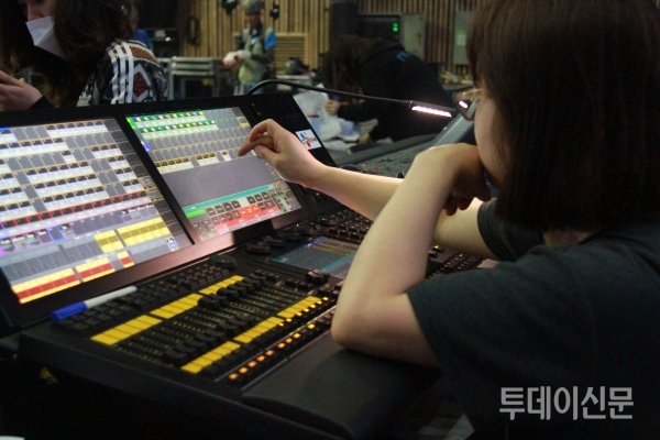 기자도 우 감독과 김 부감독을 따라 구내식당에서 점심을 먹었다. 우리는 밥을 먹은 뒤 커피를 빠르게 마신 후 스튜디오로 올라왔다. 김 부감독은 조명관련 기계 아래에서 마우스를 꺼내 쓰더니 영어로 된 버튼을 쉴 새 없이 눌렀다. 우 감독은 한 조명팀원과 함께 2PM의 신곡 뮤직비디오를 감상했다. 무대 조명 디자인을 하기 전 노래와 안무를 미리 알아야 하기 때문이다. 신나는 음악에 맞춰 우 감독의 머리와 손이 움직였다. 옆에서 이를 지켜보던 조명팀원의 어깨도 들썩였다. 주변이 시끄러운 탓에 둘의 대화가 잘 들리지 않았으나 콘셉트 이야기를 하는 듯했다.