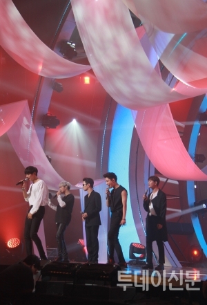 오전 8시 10분이 되자 관객이 하나둘씩 들어찼다. 불빛과 영상이 황홀하리 만치 아름답게 조화를 이뤘다. 팬들은 EXO의 몸짓 하나하나에 소리 지르며 열광했다. ‘둥둥둥’ 울리는 스피커 소리가 가슴에 내리꽂혔다. 오전 9시 30분, EXO의 녹화가 끝나고 무대가 철거됐다. 다음으로 그룹 샤이니의 무대가 이어졌고 바닥에 꽃가루가 떨어지자 관계자들은 일사불란하게 움직였다.