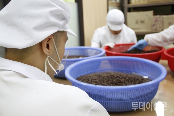 지난달 28일, 기자는 서울 강남구 개포동에 자리한 원두공장 <커피지아>로 향했다. 오전 9시, 근로자들이 하나둘씩 작업장 안으로 들어섰다. 누구는 수건, 다른 누군가는 청소기를 들고 작업장 구석구석을 청소했다. 30여분 동안의 청소가 끝나자 직원들은 하얀 위생복으로 갈아입었다. 사람들은 머리카락이 삐져나오지 않게 모자를 꾹꾹 눌러쓰고 장갑과 마스크도 말끔히 착용했다. 기자 역시 이 대열에 동참했다. 위생복을 갈아입은 장애인 근로자들은 자리에 앉아 임정실(31)사회복지사의 설명을 기다렸다. 이곳은 장애인표준사업장이기 때문에 사회복지사가 함께 일하고 있다. 잠시 후 복지사가 큰 소쿠리에 갓 볶은 원두를 가져왔다.