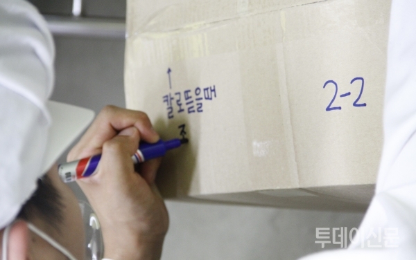이후 원두를 담은 상자를 테이프로 포장한 다음, 보낼 주소와 함께 ‘칼로 뜯을 때 조심’이라는 문장을 적는다. 이때는 글쓰기 담당 문재한(24)씨가 투입된다. 지난 2006년부터 일해온 재한 씨는 에이스로 손꼽힌다. 그가 가장 자신 있고 좋아하는 공정은 포장과 글씨 쓰는 일이다. 이곳 택배 상자 위에 적힌 글씨는 모두 그의 손을 거친 것이다.