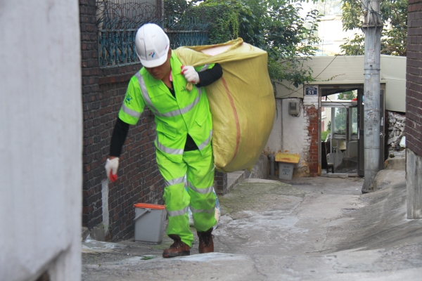 정모(56)씨와 이모(53)씨는 자신의 몸보다 훨씬 큰 마대자루를 들고 다니면서 쓰레기들을 그곳에 담았다. 조금씩 들고 오르내릴 수 없으니 큰 마대에 폐기물을 담아 한꺼번에 갖고 내려가기 위해서다. 한참 마대에 폐기물을 담던 두 사람은 큰 길가에 차가 도착하기 전, 잠시 앉아 휴식을 취했다. 우리는 가파른 골목 위 콘크리트 계단에 앉아 대화를 나눴다. 12년째 이 일을 해오고 있다는 정씨와 이씨는 “우린 입사 동기예요”하며 호탕하게 웃었다.