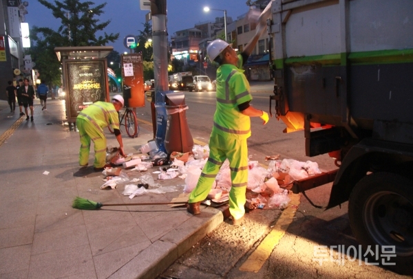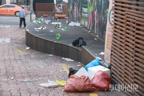 | ▲ 청소되기 전 거리의 모습 ⓒ투데이신문 | ||