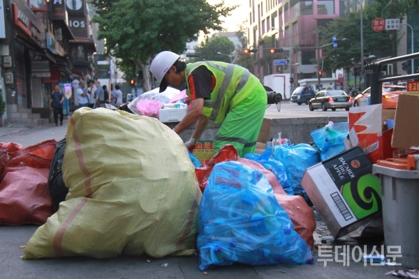 주말에 쌓인 쓰레기는 월요일에 폭풍처럼 밀려든다고 한다. 마치 밀린 설거지거리를 만난 느낌과 비슷하지 않을까 싶다. 쓰레기가 널브러져 있는 거리를 걷던 조 구역장이 “평일에는 이 정도인데 주말이 되면 더 하죠. 어휴~”하며 고개를 세차게 흔들었다. 조 구역장과 미화원 두 명은 오늘은 그나마 평일 치고 깨끗한 편이라고 입을 모았다. 30년 경력의 미화원 A씨는 “주말에 오면 더 엉망이에요. 주말에는 이 거리를 두 명이 2.5톤짜리 차량으로 6~7대를 치우니까요. 막 치우다 보면 깨진 병에 긁혀서 팔이 쭉쭉 나가요”라며 손가락으로 팔을 가리킨 채 얘기했다. 환경미화원들에게 주말 못지않게 축제나 행사도 달갑지 않다. 9월에 핼러윈데이와 같은 축제가 열리면 일이 배로 늘어나기 때문이다.