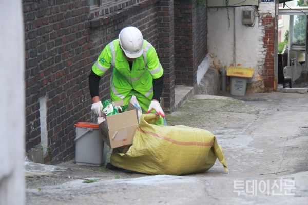 재활용 폐기물을 모아둔 곳에 사람들이 무심코 버리는 쓰레기를 치우는 것도 만만치 않다. 미화원들은 2.5톤 차량에 재활용 폐기물을 하나둘씩 실으면서 동시에 쓰레기를 손으로 집어 올렸다. 조 구역장은 “주말이나 월요일이 정말 힘들어요. 쓰레기가 200% 정도는 더 나올 걸요?”하며 쓰게 웃었다. 주말이 더 힘든 이유는 쓰레기양이 많기 때문이다. 술병도 주말에는 평일보다 3배 정도 더 많이 나온다. 조 구역장은 “주민들이 재활용 폐기물이나 쓰레기를 잘 내놓아주셨으면 좋겠어요. 그렇지 않으면 수거하는 데 시간이 오래 걸리거든요. 단속을 하긴 하는데 모두 관리할 수는 없으니까 힘든 부분이 많죠”라고 말했다.