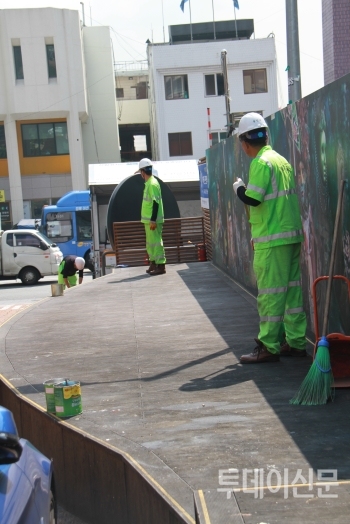 택시를 타고 30분 정도 달려 새벽 5시 20분, 녹사평역에 도착했다. 어슴푸레한 녹사평역 일대는 자동차와 사람이 적어서 그런지 신비한 느낌을 연출했다. 가는 길에 보니 한쪽에 쓰레기가 모여 마치 산이 되어 있었다. 바닥 곳곳에 검은 흔적을 남긴 담뱃재, 여기저기 나뒹구는 술병, 누군가가 만든 토사물…. 눈살을 찌푸리게 하는 광경이었다. 이런 곳에서 환경미화원들은 청소에 열중하고 있었다.