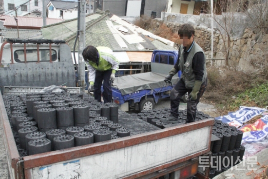 달동네에 다다를 무렵, 한씨는 육교 다리 아래로 차를 댔다. 두 사람은 보도블록 위에 폐현수막을 깔고 그 위에 연탄을 쌓아올렸다. 가파른 곳을 오를 때는 자칫 연탄이 쏟아질 수 있어 많이 실어선 안 된다. 연탄 500장을 덜어놓고 달동네로 올라갈 것이라고 김씨는 말했다.