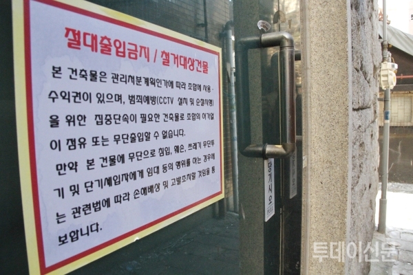 골목에 한발짝 들어서니 가장 먼저 집집마다 ‘이사’, ‘절대출입금지’라고 적힌 딱지가 눈에 띄었다. 인적이 드물어서인지 사람 냄새가 나지 않아 스산한 기운이 느껴졌다.
