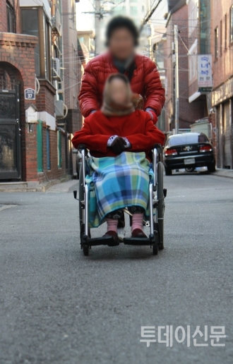 할머니를 휠체어에 안전하게 앉힌 뒤에야 혀를 내밀며 환하게 웃어 보였다. 이내 고개를 축 늘어뜨린 할머니에게 신발을 신겨주고 목도리로 얼굴을 감싸주었다. 그리고 자신은 후다닥 방으로 올라가 두꺼운 점퍼를 입고 나왔다. 조용하던 할머니가 처음으로 기자를 향해 입을 뗐다.