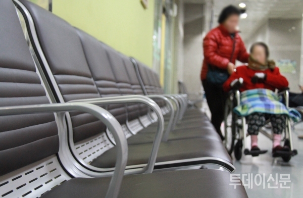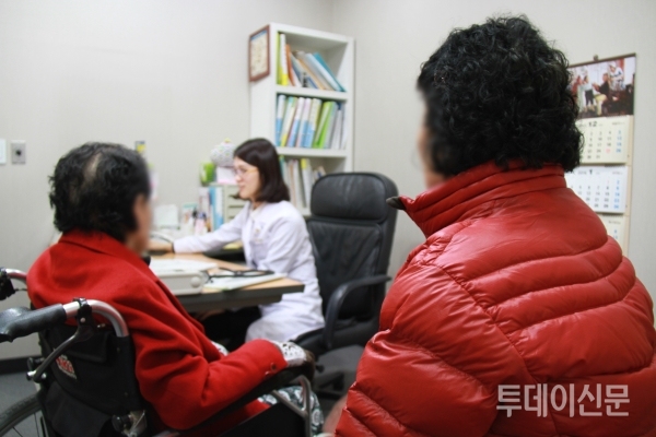 오전 10시, 이들은 자주 가는 동네 한의원에 들어섰다. 간호사가 두 사람을 반갑게 맞이하며 문을 잡아주었다. 휠체어에 탄 할머니를 물리치료실 침대로 옮기는 것은 온전히 김씨의 몫이다. 침대에 눕힌 다음에는 점퍼와 목도리, 장갑을 벗기고 편한 자세로 눕혀야 한다. 얼굴에 땀이 범벅인 김씨는 옷가지를 안고 30분 동안 대기실에서 기다렸다.