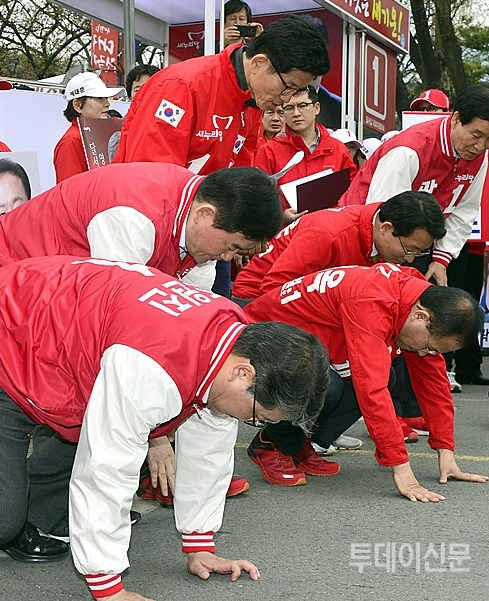 당시 세월호 참사를 터졌을 때 새누리당 지도부와 중진 의원들은 “도와주십시오” “머리부터 발끝까지 바꾸겠습니다”라고 적힌 피켓을 들고 1인 시위를 했다. 그리고 한 달 후인 7.30 재보선에서도 읍소전략을 펼쳤다.