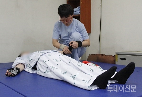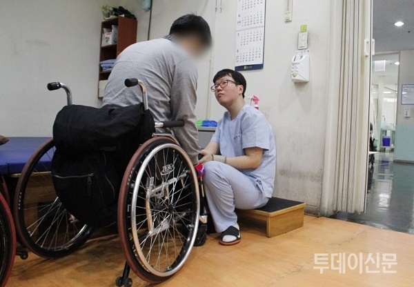 다음으로 이씨는 6층 작업치료실을 향해 바쁘게 걸음을 옮겼다. 이어 B(60‧남)씨와 재활 운동을 시작했다. B씨는 지난해 겨울, 서울에 있는 한 병원에서 의료 사고를 당해 하반신 마비가 왔다. 허리를 치료하고자 찾아간 C병원에서 수술을 한 뒤부터 다리를 못 쓰게 됐다고 한다.