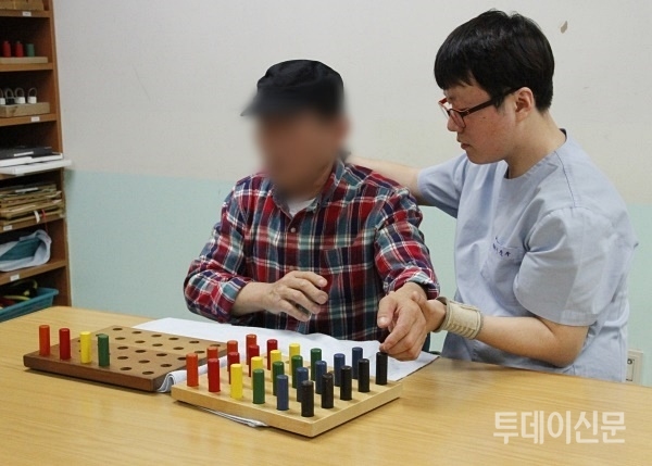편마비의 경우 초기 재활(3개월 이내)이 중요한데 그 시기를 놓치면 관절 근육이 뻣뻣해지므로 관절 운동은 필수다. 이날은 손으로 나뭇조각처럼 생긴 페그보드를 집어 제자리에 옮기는 치료를 실시했다.