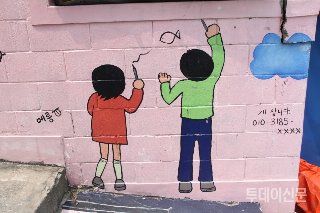 슈퍼를 지나서 각양각색의 페인트 물감으로 단장한 계단을 올라 좁은 골목길에 닿으니 벽면을 화려하게 수놓은 벽화들이 기자를 반긴다. 화려한 회화보다는 소소한 일상을 담은 벽면의 그림들은 보는 이의 마음을 편안하게 하는 힘을 가졌다.
