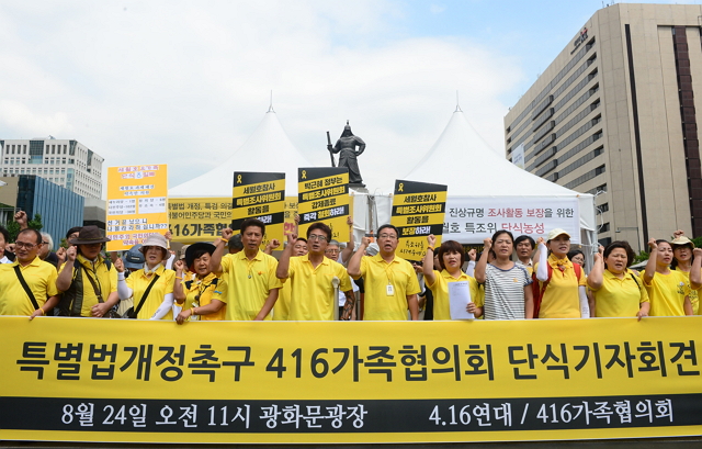 4·16세월호참사 가족협의회는 24일 오전 서울 종로구 광화문 광장에서 기자회견을 갖고 특별법 개정, 특검 의결, 세월호특조위의 선체조사 보장을 요구하며 무기한 단식에 돌입했다.
